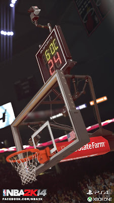 The player animations in NBA 2K14 on PlayStation 4 and XBOX One are not the only thing that is beautiful. Check out, for example, the detail of the basket: the camera, the ring, the shot clock, the wiring, the net, etc. These kind of details are unlocked with the power of the next generation consoles.