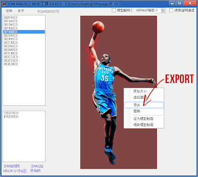 3. Look for Kevin Durant texture (001848C9) on the left side, then right click the image and choose export. Save the .dds file to your desktop, for easy access.