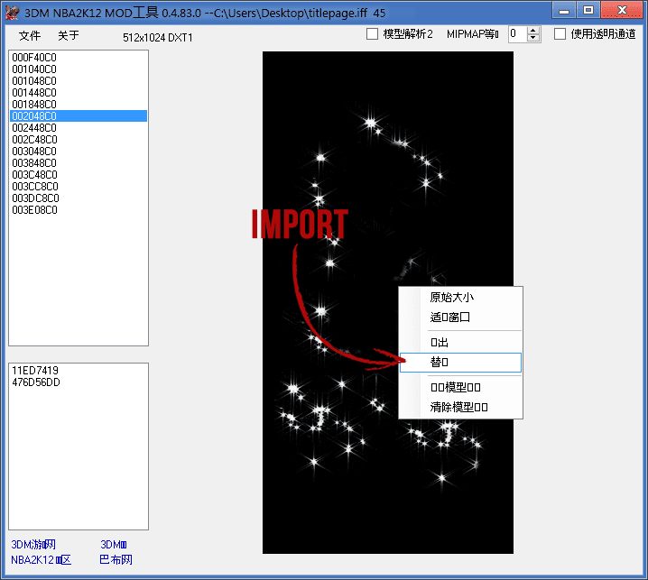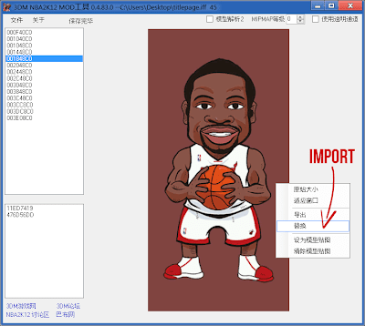 10. Again, import the .dds file using the 3DM Mod tool and repeat the process with the overlay texture of Blake Griffin and Derrick Rose.