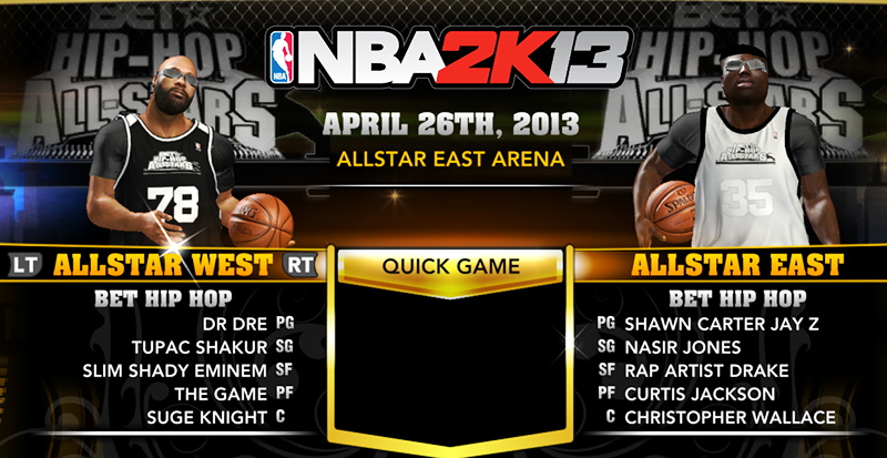 Description: This mod adds two all-star teams in the game which consist of the biggest names in the hip-hop industry. Let's bring the rivalries of hip-hop on the basketball court and find out who will dominate the game. It'll be the East Coast facing off the West Coast in NBA 2K13!