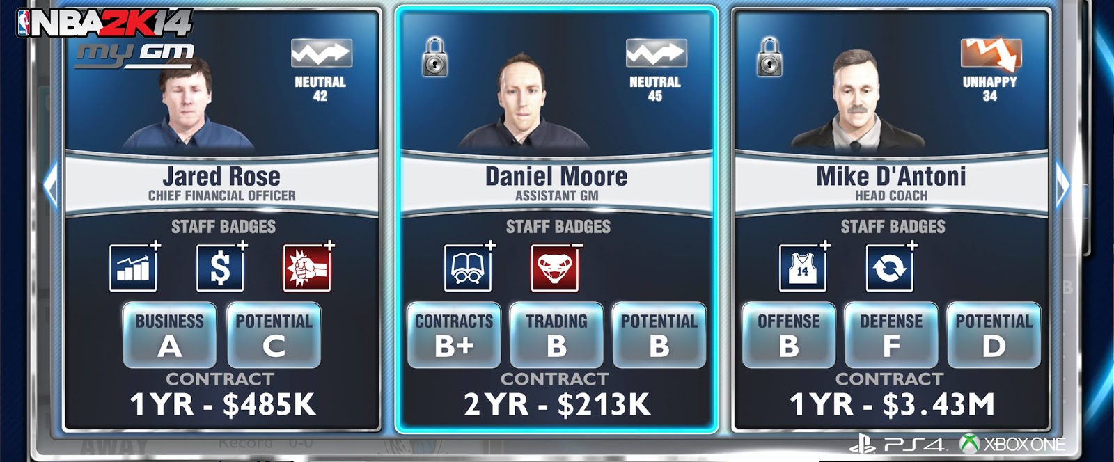 2K Sports completely re-designed team Staff and how they interact with the game. Staff members at each position can have up to 3 Staff Badges; these are the staff equivalents of Signature Skills. Be careful though, Staff can also have negative Staff Badges that may put your team at risk. Putting together a staff that fits the makeup of your roster is critical in building a championship roster.