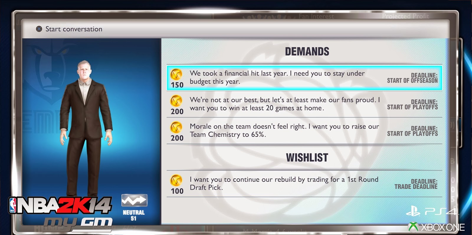 Your owner will give you a list of Demands and Wishlists, all based on his personality, that he will want you to accomplish throughout the season and offseason. If you venture too far off course, you’ll likely find yourself unemployed. Do well enough, and you’ll be afforded the opportunity to be your own boss when your purchase your own NBA franchise.